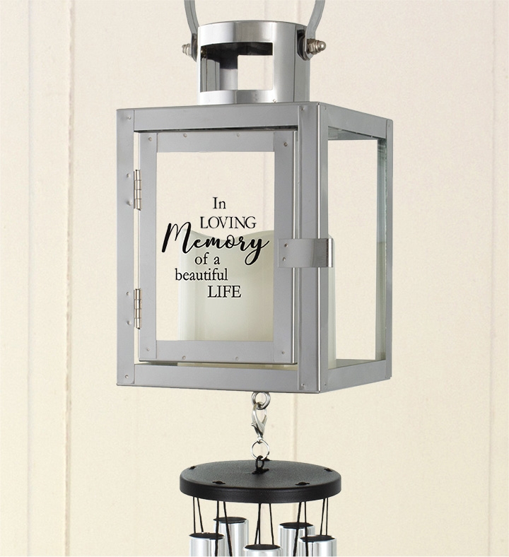 A shining tribute to a beautiful life. Our soft glow, silver-toned lantern doubles as a wind chime with long, dangling crystals that create soothing tingles with each breeze. Featuring the heartfelt sentiment, “The love in our family flows strong and deep, leaving us memories to treasure and keep”, it’s a truly elegant gift of remembrance.