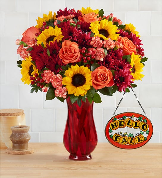 Celebrate fall’s splendor with our enchanting gathering. Rich red and orange blooms mix with golden yellow sunflowers, creating a gift that captures autumn’s endless warmth and intimacy.