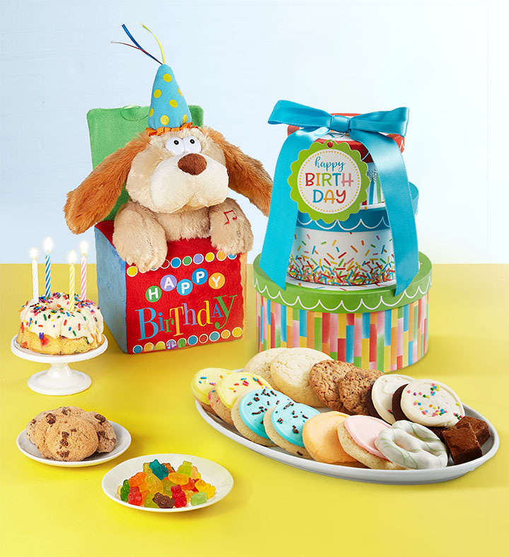 For an instant party, just add our all-in-one birthday bundle! First up is “Flappy,” our animated plush dog, who moves & grooves to the Beatle’s classic “Birthday” song. He’s paired with our three-tiered tower from Cheryl’s, filled with delicious favorites, including buttercream cookies and a miniature cake with candles. It’s the ultimate way to celebrate their big day.