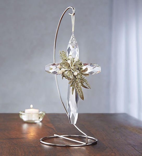 A symbol of faith, hope and love, the cross can bring a sense of peace and comfort to those grieving the loss of a loved one. Our multi-faceted jewel pendant cross is embellished with elegant Champagne-colored white berries and boughs, and features a silver-tone filigree holder on top. This beautiful tribute can easily be displayed somewhere special in the home with our matching silver-tone ornament stand.