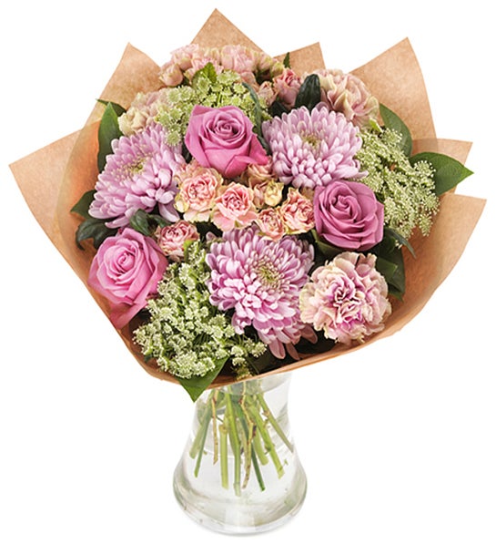 Sweep someone off their feet with this dream of a bouquet. A magnificent mixture of flowers in romantic and feminine colours. Hand-tied, decoratively wrapped and delivered to the door. **The vase is not included.**