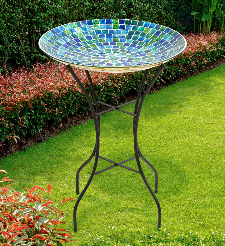 Feathered friends will enjoy splashing the day away in our captivating bird bath! The modern mosaic glass tile design features shades of blue and green. Supported by a durable metal stand, it’s a beautiful-meets-functional garden display.