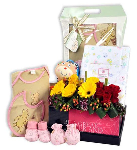 Send a basket of sweet lullaby with all these adorable gifts for the newborn baby! Includes Rattatouli, the Musical Baby Rat, Baby Kasey Gift 4pc Set (Baby T-shirt, mittens, Booties and Bib) and Baby Play Cloth Diaper 24X24 Set. Gift comes bundled in a designer PPG box with Roses, Gerberas and Berries.