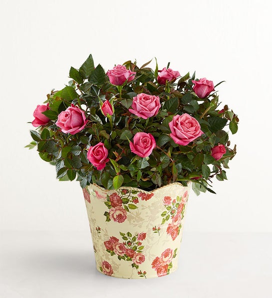 Our classic rose plant exudes pure charm! Tucked inside a rose-pattern planter with delicate gold scallop rope rim, this radiant keepsake adds a touch of timeless elegance to any space. Add our rose-scented Yankee Candle® for a truly versatile and unforgettable gif