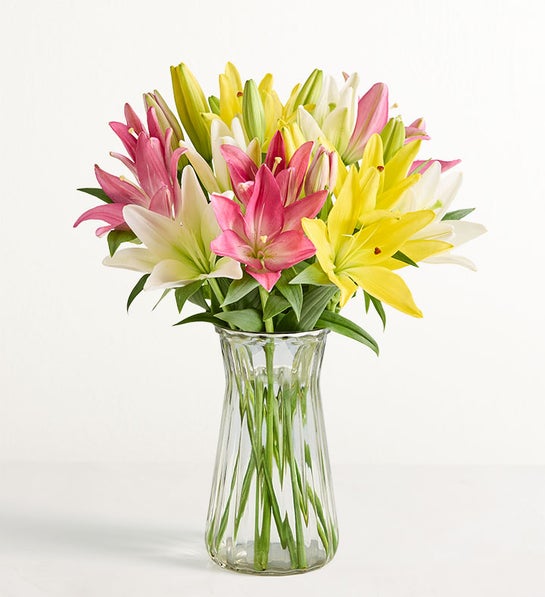 Celebrate Mom with our sweet spring lilies. Fresh, fragrant blooms in pink, white and yellow are gathered into a delightful bouquet to capture everything you love about her on Mother’s Day. Send a bouquet of over 25 blooms…or a deluxe gathering of over 50 blooms.