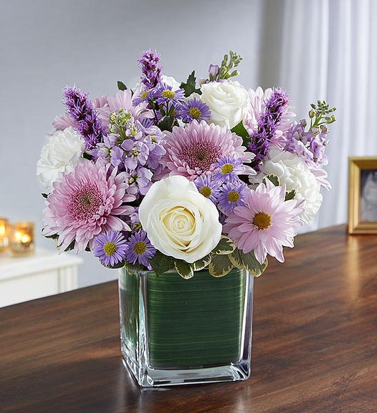 Sometimes in soothing the tears of another, we soothe our own sadness, as well. Our sympathy arrangement of calming lavender stock, daisy poms, white roses and carnations, expertly gathered together in a clear glass cube lined with Ti leaf ribbon, is a graceful gesture of comfort and healing.